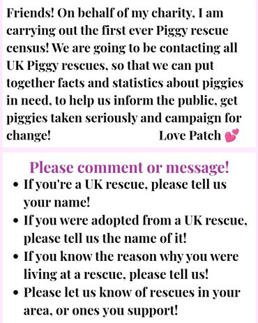 I founded Patch’s Piggy Trust to help piggies who’ve been less fortunate in life than myself. I was shocked to find out that not all piggies having a loving home like I do and horrified to learn that there are thousands of piggies in the country who are frightened, hungry, sick, unwanted, dumped and need somewhere safe to go. When I first visited a rescue to learn more, I could not believe how much time, effort and love the kind humans put into saving lives and taking care of everyone.